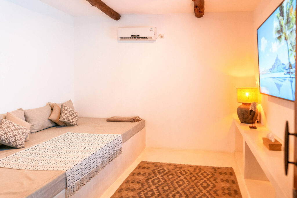 Villa Onu private cinema room is a multipurpose space that is outfitted with an extra-large smart TV, surround sound and cozy seating.